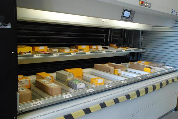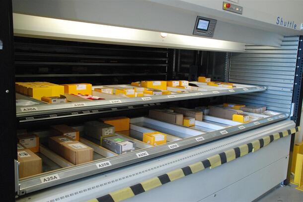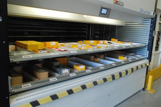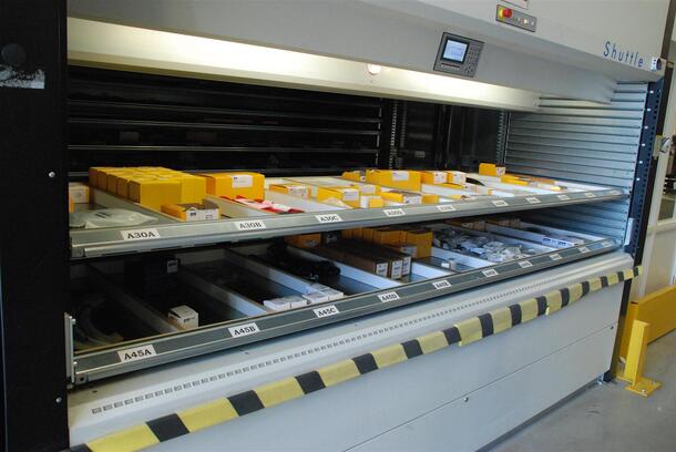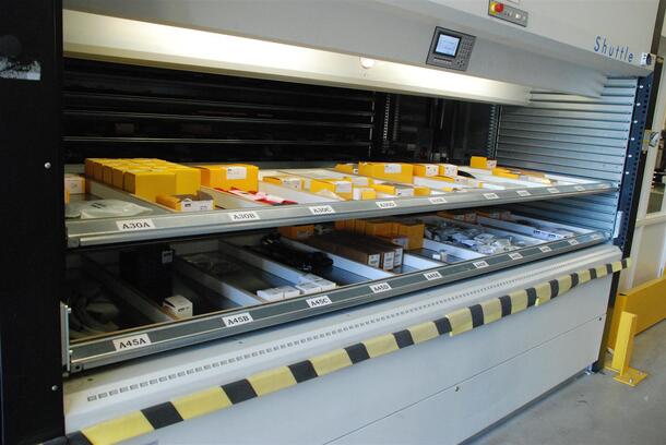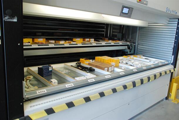 DYNSTO can offer you in very good condition KARDEX Shuttle XP 500 , 3050 x 864 — 4950 mm — 46 trays , Y.o.B : 2006