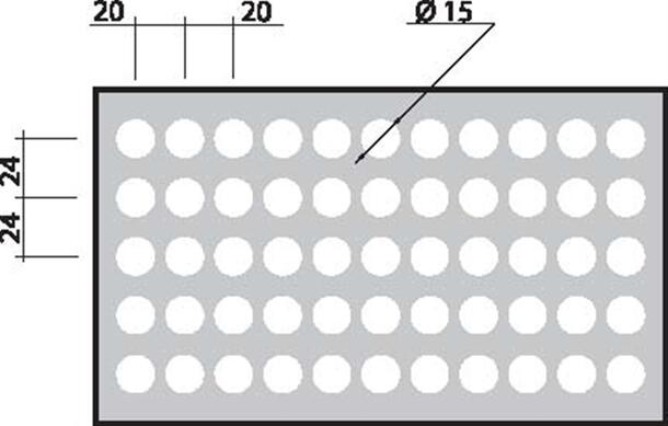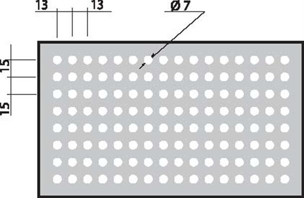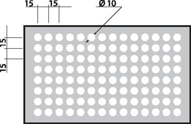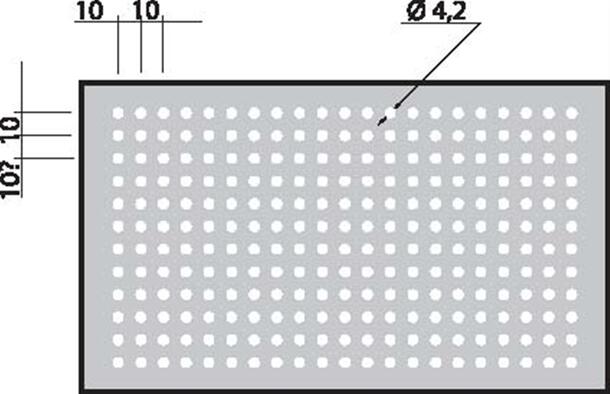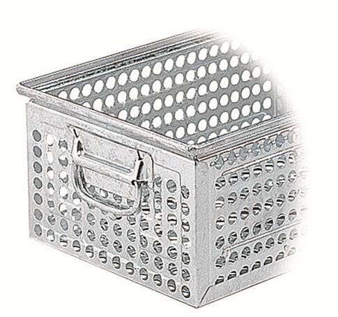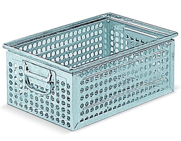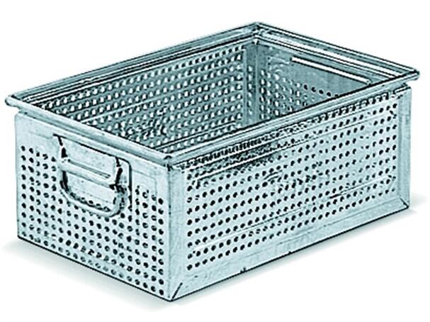 FAMI Stainless Steel & Metal Heat Galvanised perforated stacking container , Serie FLA , Size : 272-4 External dim. L x D x H : 450 x 300 x 200 mm Internal dim.. L x D x H : 442 x 285 x 182 mm Capacity : 27 litres Hole diameter : Ø 3 till Ø 15 mm Distance hole to hole : 9 till 20/24 mm Material : Stainless Steel & Metal Heat Galvanised