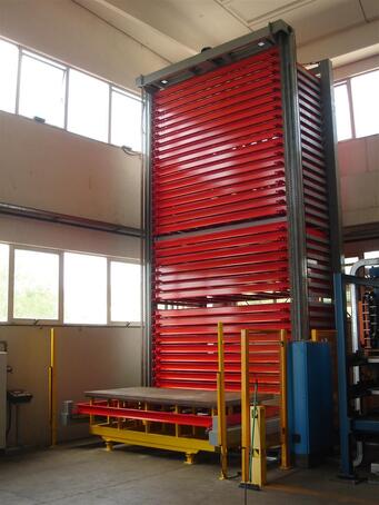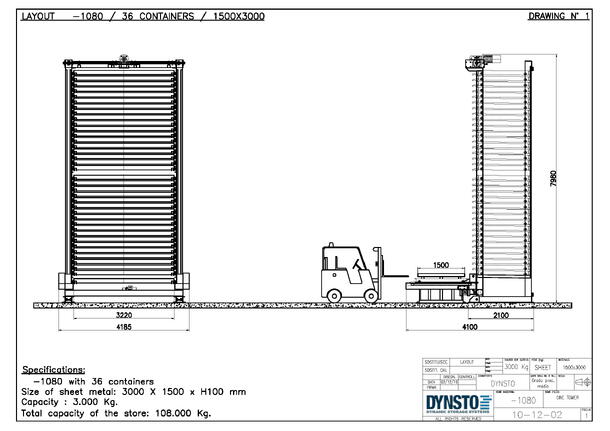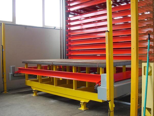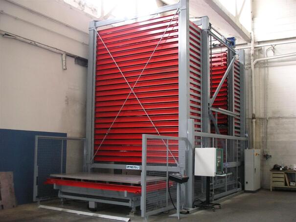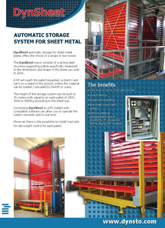 DynSheet ( Italy ) automatic storage for sheet metal plates offers the choice of a single or twin tower. The DynSheet tower consists of a strong steel structure supporting pallets specifically measured to the dimensions and shape of the sheet you wish to stock. A lift will reach the pallet requested, extract it and carry on a stand to the ground, where the material can be loaded / unloaded by forklift or crane. The height of the vertical storage system can be built to 15 meters with capacity on each pallet of 2000, 3000 or 5000kg according to the sheet size. Connecting DynSheet to a PC loaded with compatible software can allow you to operate the system remotely and in real time. Moreover there is the possibility to install load cells for last weight control for each pallet.